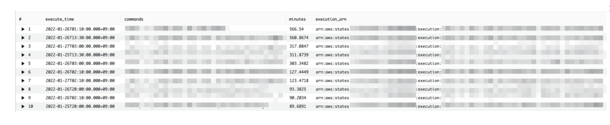 下記はAWS Step Functionsの実行単位ごとに実行時間を集計してみた例となります。